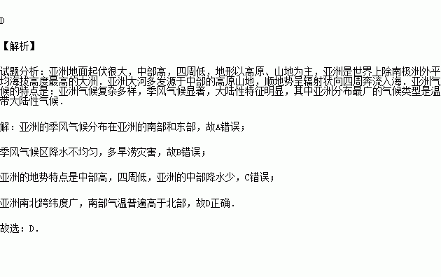D.亚洲南北跨纬度广,南部气温普遍高于北部