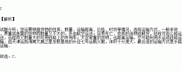 由天津运抵海南文昌卫星发射基地的长征七号运载火箭,体积十分庞大,最合适的运输方式是( )