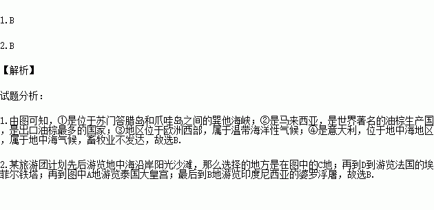 2.某旅游团计划先后游览地中海沿岸阳光沙滩、埃菲尔铁塔、泰国大皇宫、印度尼西亚婆罗浮屠塔等景点,其游览线路是( )