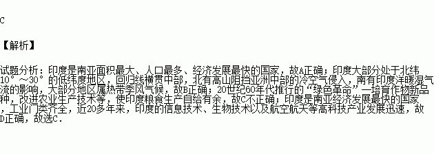 C.现在印度的粮食还需要进口 D.核工业、软件工业、航天工业发达