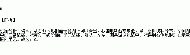 小华利用暑假游览祖国的大好河山,他设计的游览线路如下面左图,四条游览线路中,能得到右侧地形剖面示意图的是( )