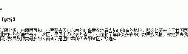 暑假期间,小明要去位于天山的吐鲁番盆地,看火焰山神奇的地貌。而小丽却想了解多姿多彩的少数民族风情,请帮助他们选择要去的省级行政区最好是( )