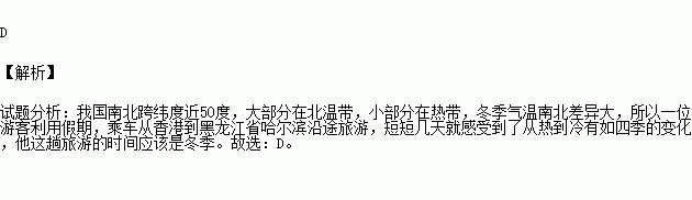 一位游客利用假期,乘车从香港到黑龙江省哈尔滨沿途旅游,短短几天就感受到了从热到冷有如四季的变化,他这趟旅游的时间应该是( )