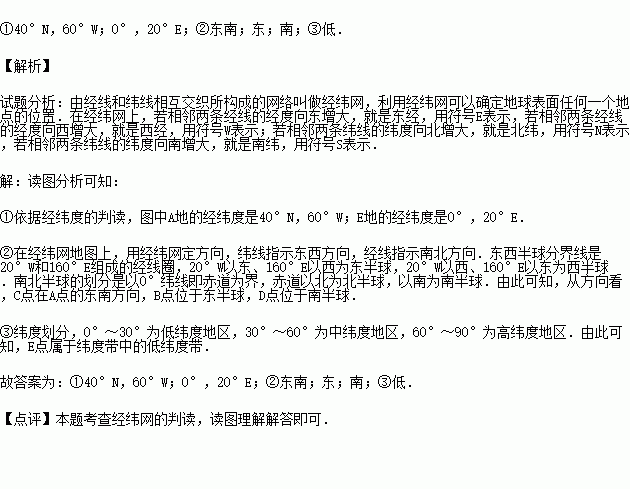 ①请写出A、E两地的经纬度(先写纬度再写经度)