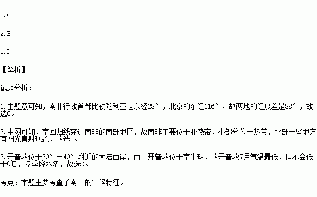 2.与南非的纬度位置相符的描述是