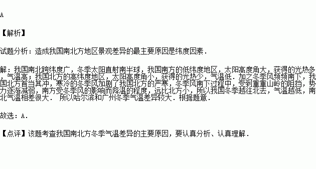 去年寒假,小李同学乘火车从哈尔滨到广州游玩,他发现这两座城市的气温差异很大,造成这种差异的主要原因是( )