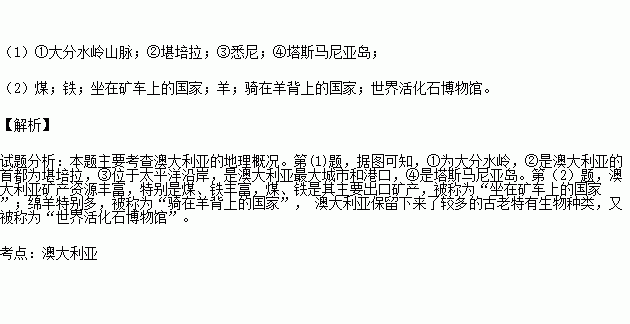 (2)澳大利亚是个矿产资源丰富的国家,_______、_______(矿产)的出口,在世界上占重要地位。有“_______”之称;还因为澳大利亚的_______特别多,被称为“______________”;此外,澳大利亚保留下来了较多的古老特有生物种类,又被称为“______________”;
