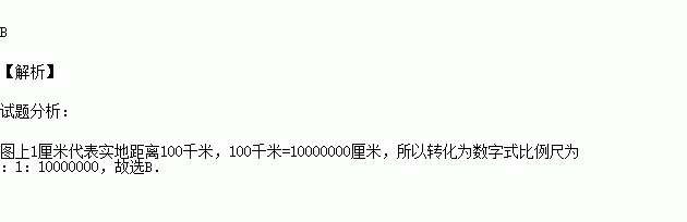 图上1厘米代表实地距离100千米,其比例尺为