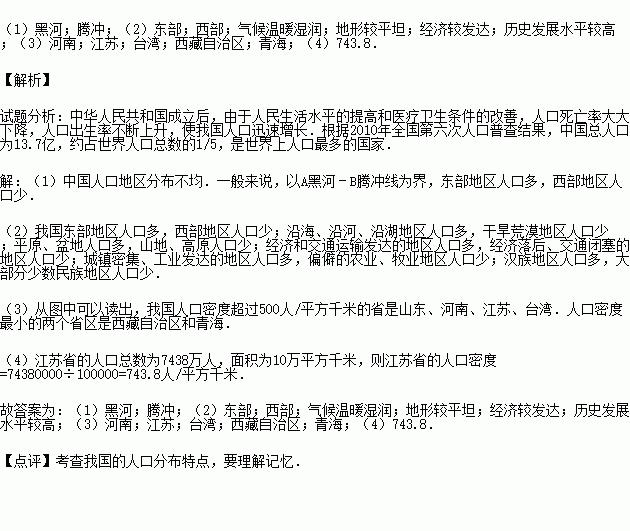 (1)我国人口的地理分界线是黑龙江省的A 市到云南省的B 县一线,在图中用直线连接起来.