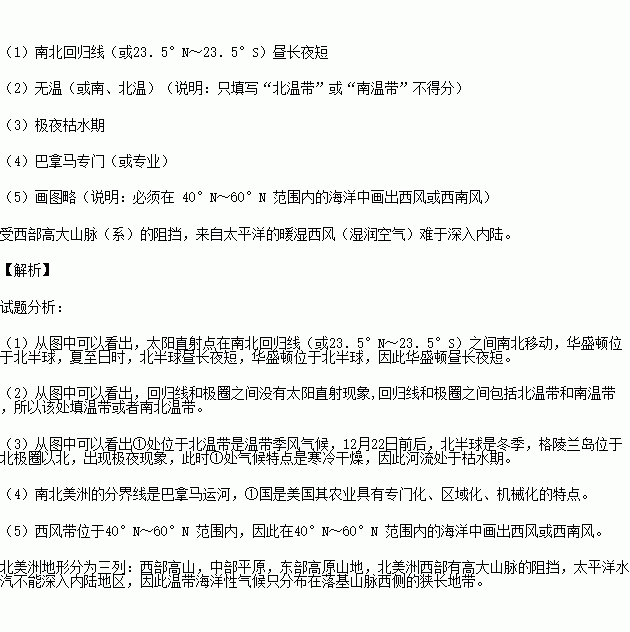 (1)太阳直射点总是在________________(纬度范围)之间来回移动;夏至日,华盛顿的昼夜长短情况是_____________。