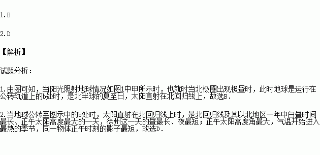 1.当阳光照射地球情况如图1中甲所示时,地球运行在乙中的( )