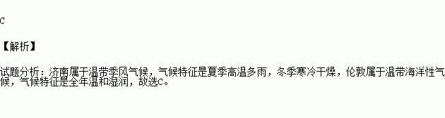 “济南的冬天是响晴的”,伦敦“冬天要能看得见日光,便觉得是怪事”。下列选项中分别表述济南和伦敦气候特征的是: