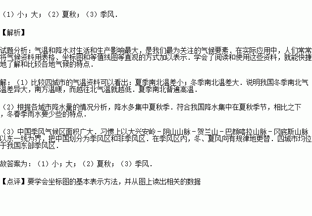 (1)比较四城市的气温资料可以看出:夏季南北温差 ;冬季南北温差 .