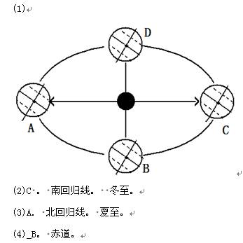 (4)当地球运行到 点时(填字母),太阳直射在 ,此日离我国国庆节最近。