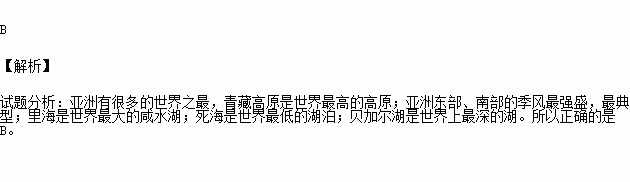 亚洲地域辽阔,山岳巍峨,气候复杂多样,拥有众多的“世界之最”。下列关于亚洲的世界之最的叙述中,你认为正确的是( )
