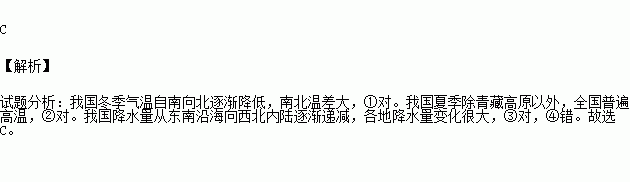 ①冬季我国南北方普遍低温,差别不大 ②夏季我国大多数地区普遍高温 ③年降水量分布的总趋势是从东南沿海向西北内陆递减 ④我国各地年降水量差别不大