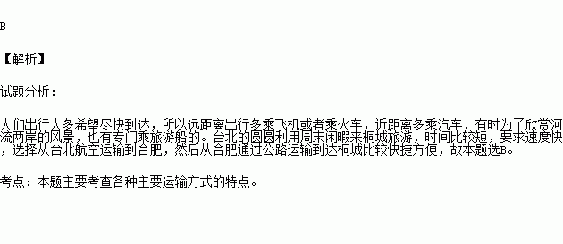 台北的圆圆利用周末闲暇来桐城旅游,她选择的交通运输方式和中转地最好是( )