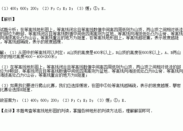 (2)鞍部是 (字母)、山谷是 (字母)、陡崖是 (字母)、山脊是 (字母).