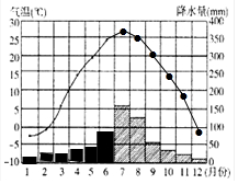 (2)根据资料和所绘制的图象分析,该地气温的特点是夏季高温多雨,冬季寒冷干燥;该地的最高月平均气温出现在7月份,为26°C;最低月平均气温出现在1月份,为-3°C;该地的气温的年较差是26°C-(-3°C)=29℃.