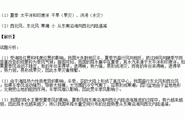 (1)据图可知,我国的降水集中在________(季节),其水汽来源于________洋和________洋。如果夏季风活动不稳定,容易导致的气象灾害是________、________。