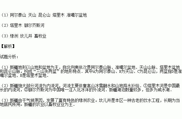 (1)新疆是“三山加两盆”的地形,图中的A、B、C指的是“三山”,其中A为 、B为 、C为 ,“两盆”指D 盆地、E 盆地。