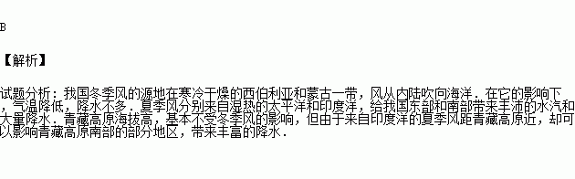 A.夏季风势力比冬季风强 B.夏季风的源地距青藏高原近