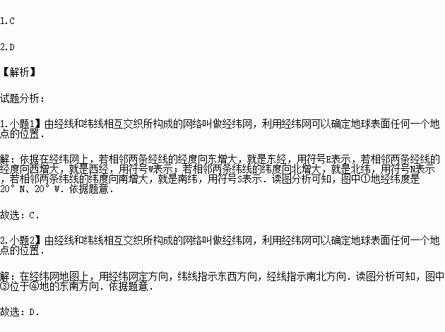 A.20°N、20°E B.20°S、20°E C.20°N、20°W D.20°S、20°W