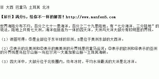 (1)写出图中序号、字母代表的大洲和大洋名称:⑤__洲;B__洋.