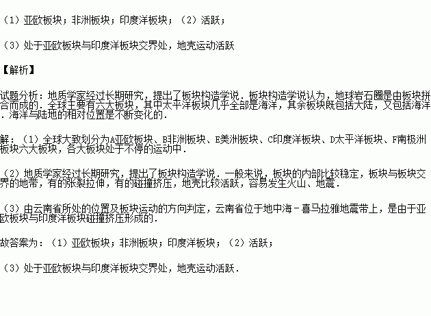 (2)各大板块处于不断运动之中.一般来说,板块内部地壳比较稳定,板块与板块交界地带,地壳比较 .