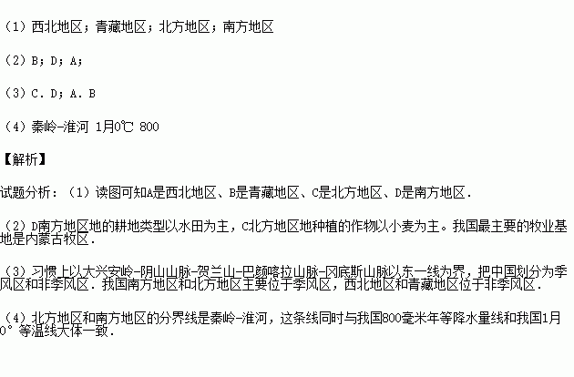 (2)D地的耕地类型以 为主。 C地种植的作物以 为主。我国最主要的牧业基地是 。