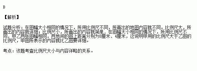 在甲、乙两张图幅大小相同的地图上,某两地之间的图上距离分别为8厘米和4厘米,这说明( )