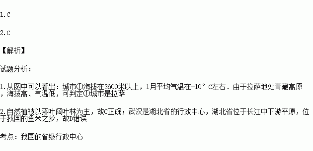 1.根据图中海拔和1月均温数值,可以推断城市①是