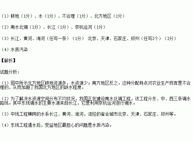 (1)图中所示北方地区 资源多, 资源少;南方地区反之。这种分配特点对农业生产而言是 (合理或不合理)的,从而加剧了我国 地区的缺水程度。