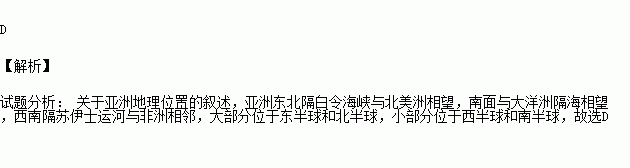 D.亚洲全部位于东半球和北半球