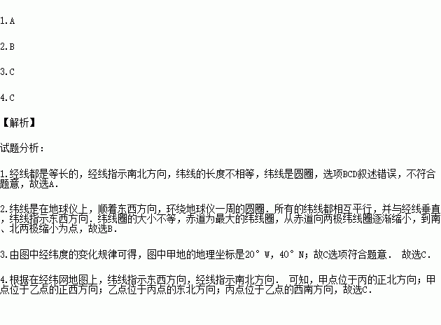 C.每条经线能形成一个圆 D.纬线指示南北方向