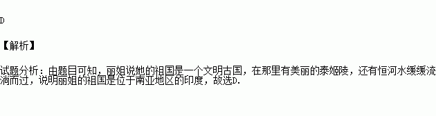 丽姐说:“我的祖国是一个文明古国,在那儿,美丽的泰姬陵静静地矗立在南亚的艳阳下,悠悠的恒河水缓缓流淌而过。”你知道丽姐的祖国是