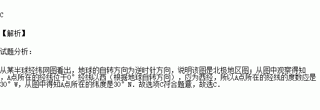 下图是“某半球经纬网图”,根据图中信息,判断A点的经纬度为 ( )