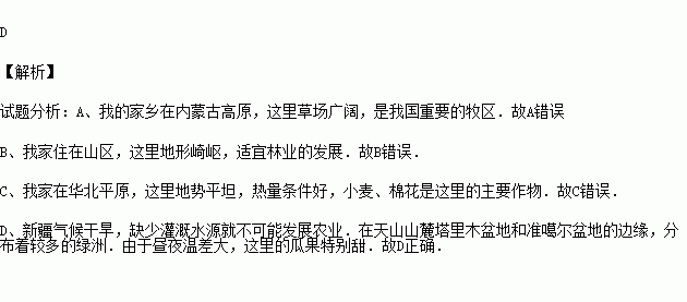 D.我的家乡在新疆,这里的绿洲农业发达,瓜果特别甜