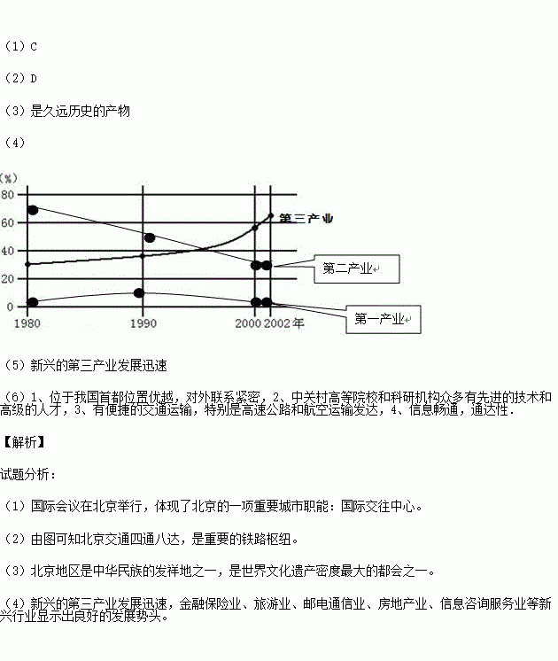 (5)从所绘制的图可以看出,北京三类产业部门中所占比重状况发生较大变化,请说出这一变化趋势是__________________________________________________________。