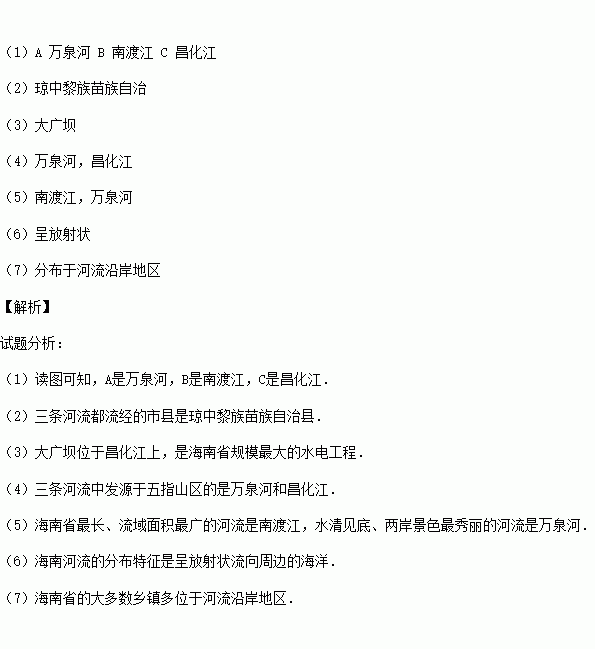 (4)三条河流中发源于五指山区的是 、 ;(o为市县的行政中心)
