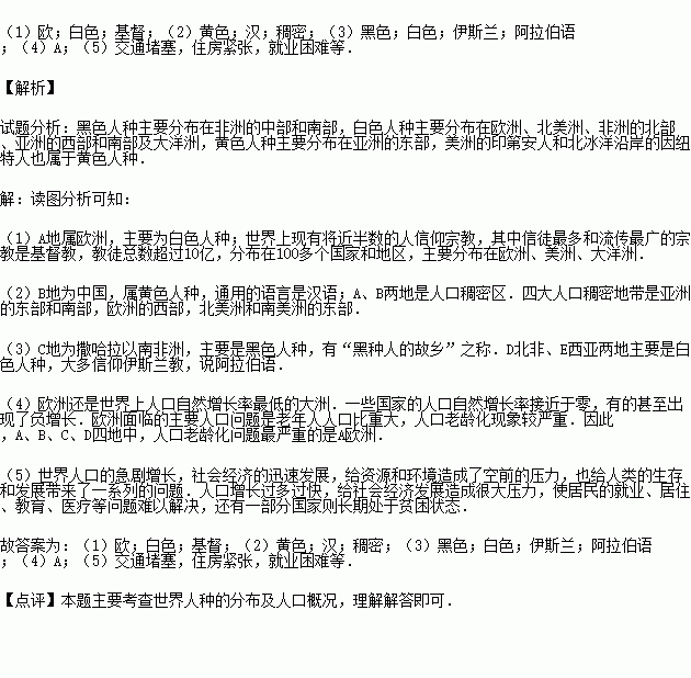 (3)C地主要是 人种.D、E两地主要是 人种,大多信仰 教,说 (语言).