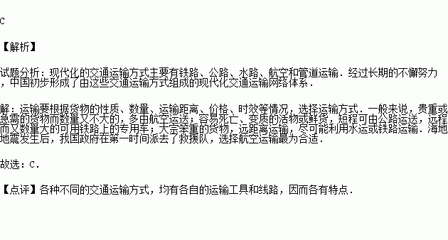2010年1月12日,发生在海地的7.3级地震,给当地造成了巨大的人员伤亡和财产损失.我国政府在第一时间派去了救援队.该救援队选择了下列哪种运输方式到达灾区( )