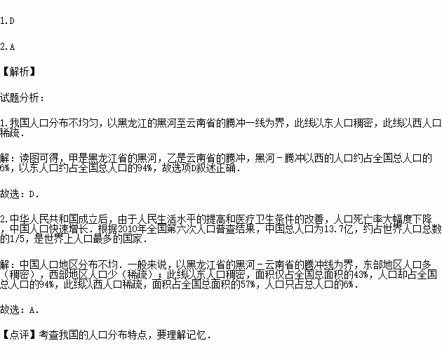 D.甲乙线西北人口占全国的6%