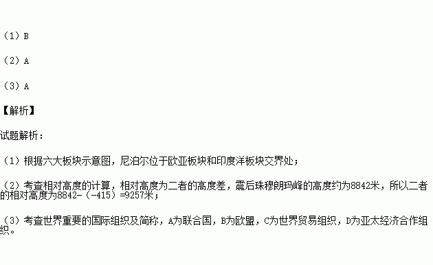 (1)尼泊尔位于下列哪两个板块交界处( )