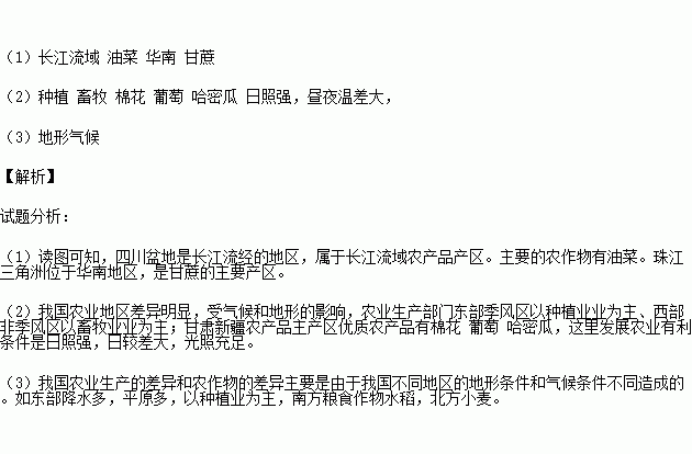 (2)我国农业地区差异明显,农业生产部门东部季风区以 业为主、西部非季风区以 业为主;甘肃新疆农产品主产区优质农产品有 ,这里发展农业有利条件是 。