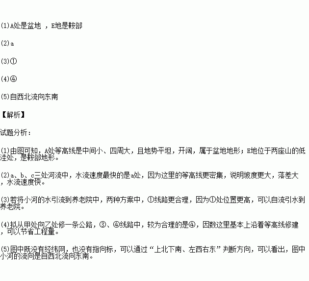 (3)若将小河水引向疗养院,图中有两条计划线路,①、②线路中合理的是 .