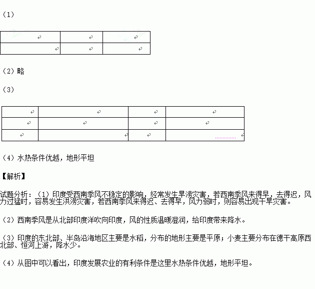 £¨3£©Ó¡¶ÈµÄµØÐκͽµË®Ó°Ïì×÷ÎïµÄ·Ö²¼£¬¸ù¾ÝͼÖÐÐÅÏ¢Íê³ÉÏÂ±í¡£