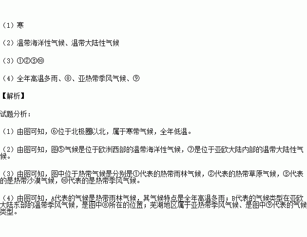 (1)⑥位于北极圈以北,它属于 (热、温、寒)带的气候。
