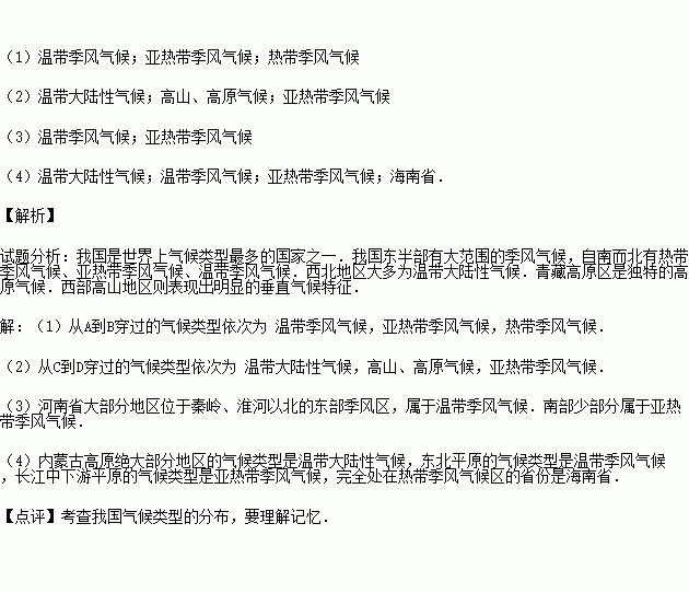 (4)内蒙古高原绝大部分地区的气候类型是 ,东北平原的气候类型是 ,长江中下游平原的气候类型是 ,完全处在热带季风气候区的省份是 .