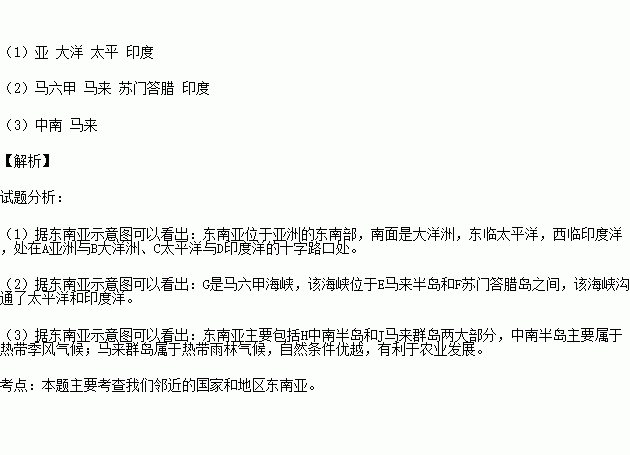 (1)东南亚位于A_______洲和B_______洲、C_______洋和D_______洋之间的“十字路口”。